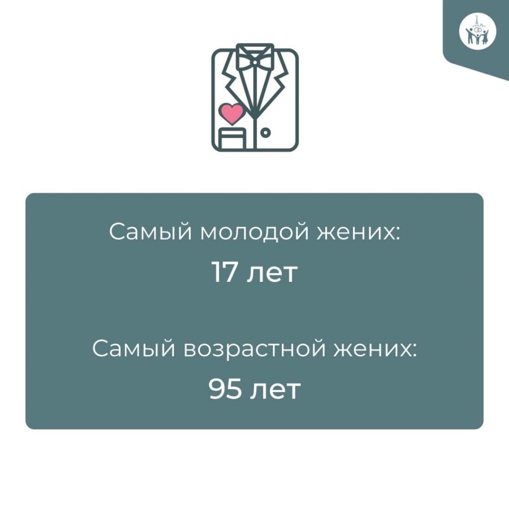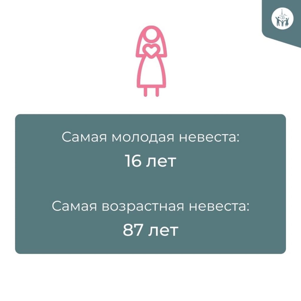 Самой молодой невестой оказалась 16-летняя девушка, самой пожилой — дама в возрасте 87 лет. Женихами становились мужчины от 17 до 95 лет.