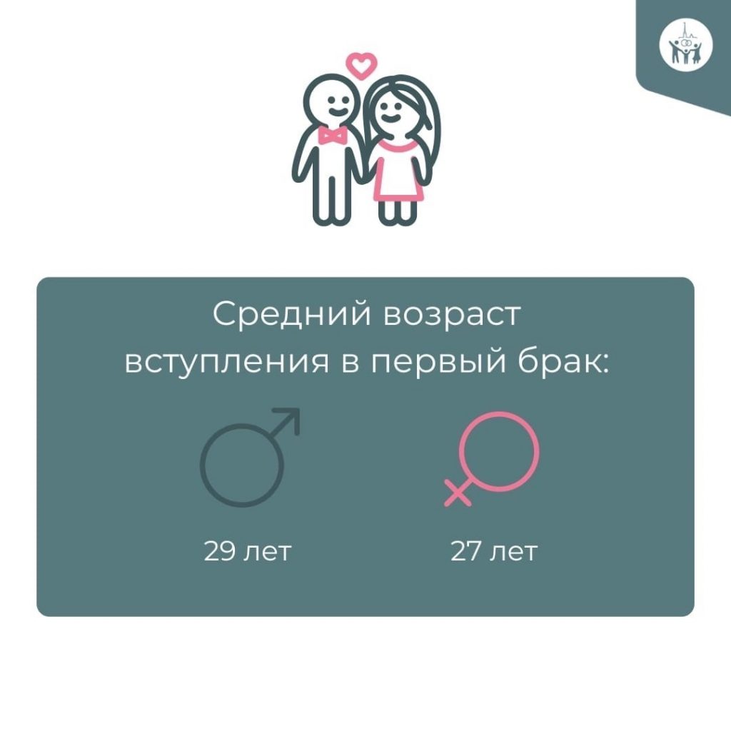 Средний возраст вступления в первый брак составил 29 лет для мужчин и 27 лет для женщин.