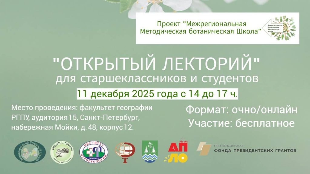 ЧОУ ДО «Экологический образовательный центр» приглашает старшеклассников и студентов принять участие в Открытом Лектории в рамках проекта «Межрегиональная Ботаническая методическая Школа»